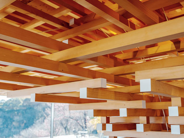 この建築の構造は、積層された80mm角の細長いヒノキの枝が構造体になっています。
