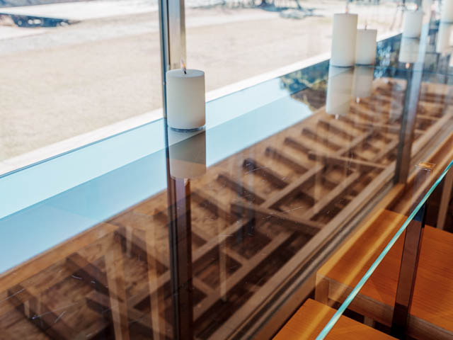 周囲の景色を増幅するような反射性の高いテーブルが置かれています。