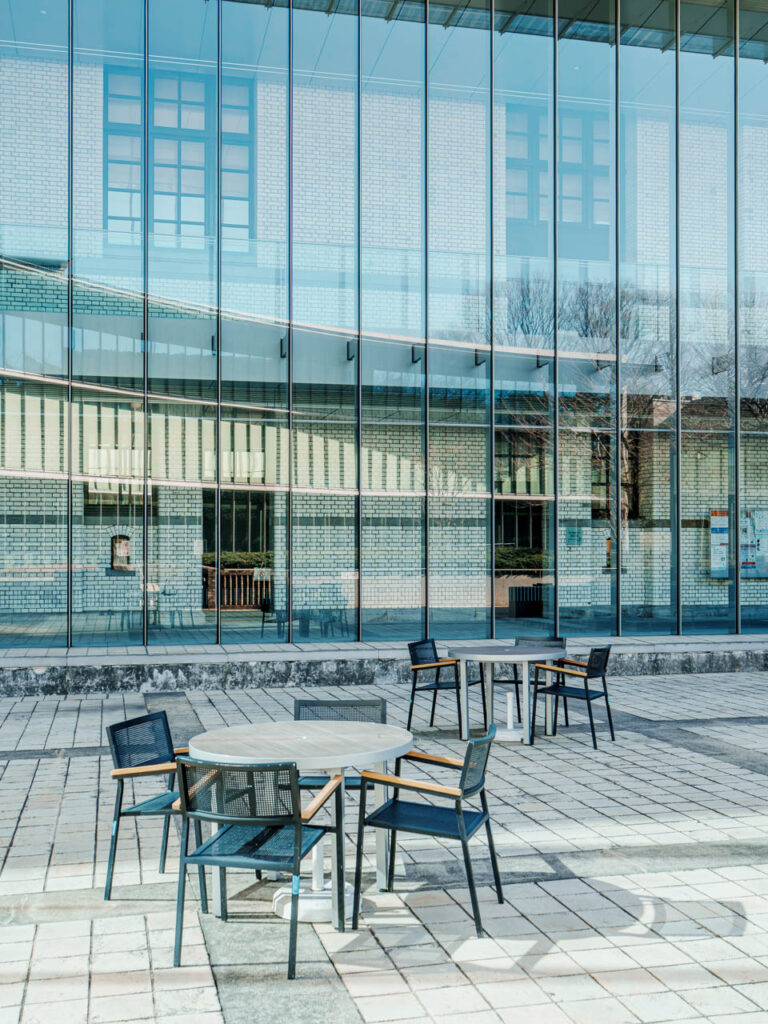 ガラスボックスに設けられたカフェもあり、魅力的な空間でゆっくりと過ごすこともできます。