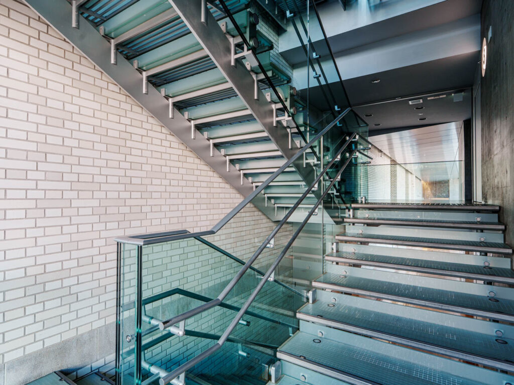 この階段は、印象的なレリーフの手すりを覆うように、ガラスが設けられた美しい階段となっています。