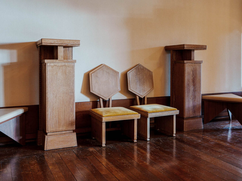 全一とは、建築だけでなく、インテリアも合わせて一つの建築という考えで、照明や椅子などの家具も全て遠藤新さんのデザインになっています。