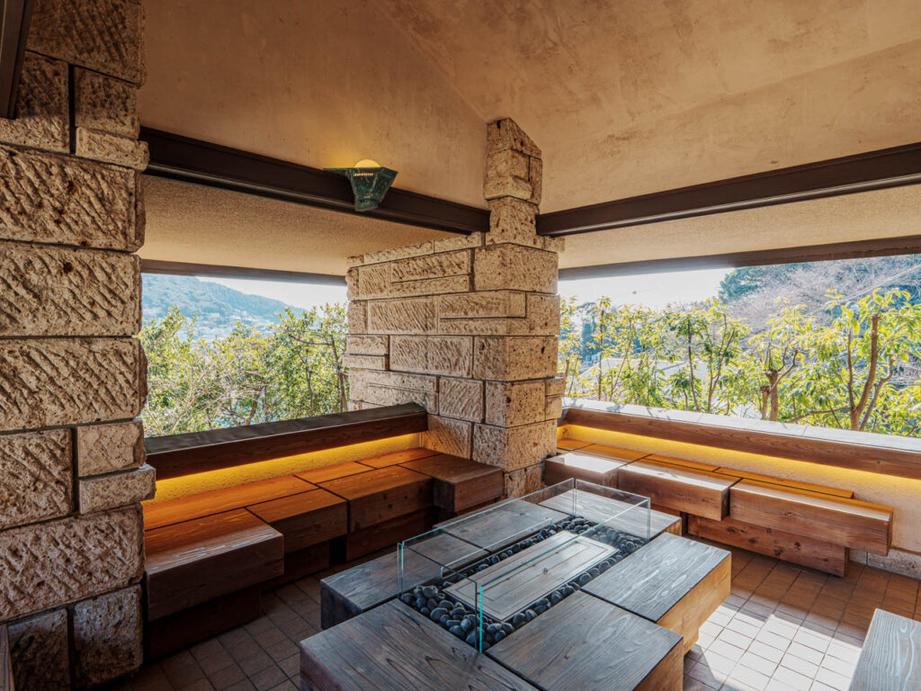 大谷石の柱に囲われた、見晴らしのいいテラスもとても印象的で、さまざまな場所で葉山の自然を感じることができます。