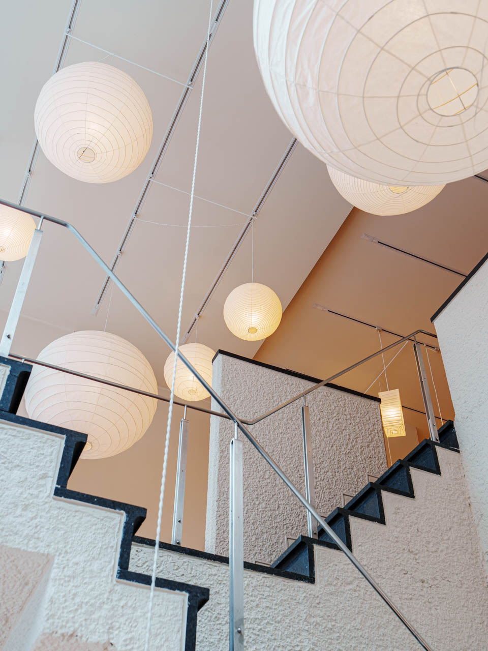 吹き抜け内の階段が1階と2階を繋いでいますが、大小様々なAKARIが吊るされていて、来た人をワクワクさせてくれる空間。