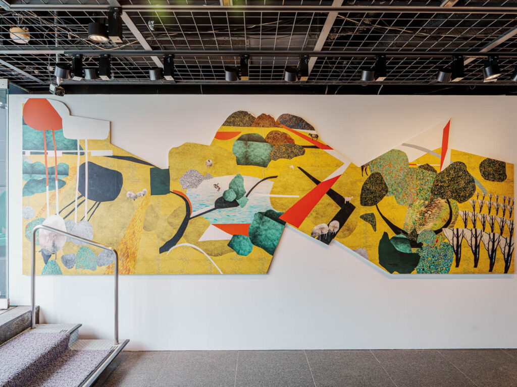 カラフルなコラージュドローイングが混在する展示構成になっています。